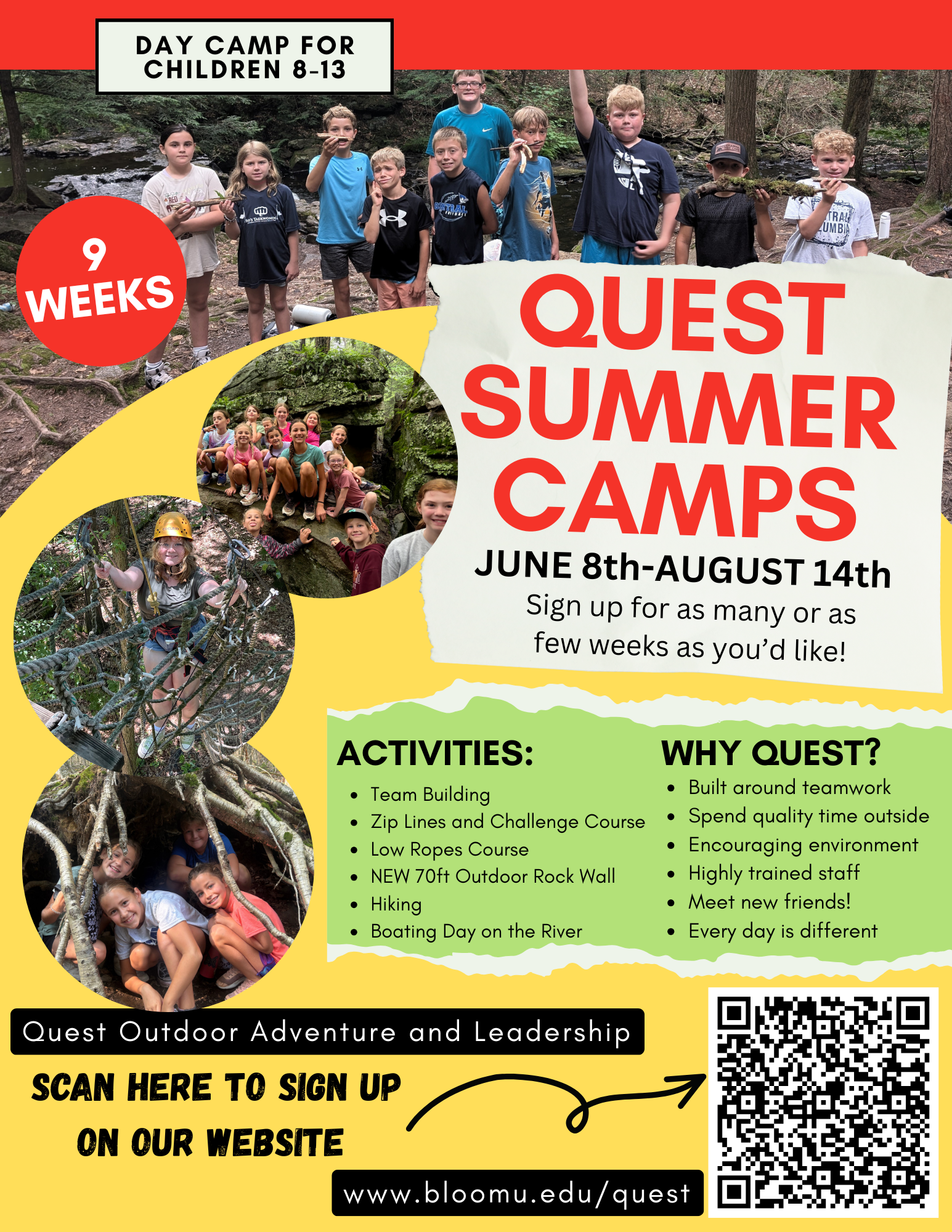 The Quest Adventure camp philosophy is to serve youth (ages 8-13 years old) by providing hands-on, engaging, and adventure-filled programming. Our activities are designed to help each camper become more independent, enhance self-confidence, develop self-awareness, to develop mind, and body in a fun and safe learning environment.